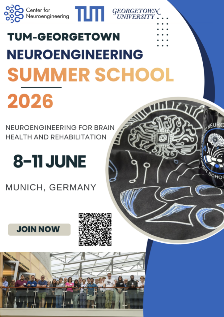 The Georgetown-TUM Neuroengineering Summer School is a yearly event co-organized by our teams at the Center for Neuroengineering at Georgetown University and the Center of Competence in Neuroengineering at TUM. This year’s Neuroengineering Summer School will focus on “Neuroengineering for Brain Health and Rehabilitation”. Registration for this year’s Georgetown-TUM Neuroengineering Summer School is officially open!